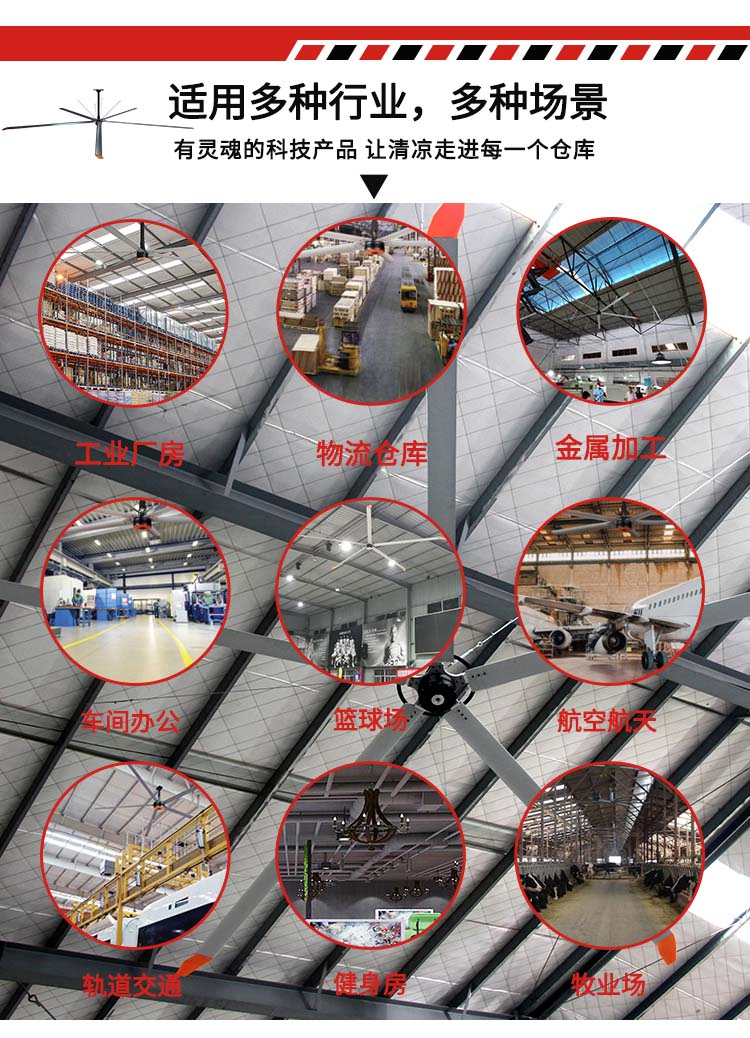 工業(yè)大風(fēng)扇廣泛應(yīng)用于工業(yè)廠房、物流倉庫、配送中心、汽車4S店、機(jī)場車站、展覽館、體育館、軍事訓(xùn)練營、大型賣場等高大空間,作為高大空間通風(fēng),人工降溫的首選解決方案。